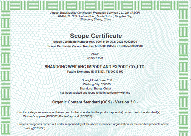 公司自營(yíng)和代理服裝、食品、五金、化工、機(jī)電等各類(lèi)商品及技術(shù)的進(jìn)出口業(yè)務(wù),公司有專(zhuān)門(mén)的生產(chǎn)、加工基地,并通過(guò)了Oeko - Tex Standard 100、GRS、OCS、RCS、USCTP等多項(xiàng)認(rèn)證,可以按客戶(hù)要求設(shè)計(jì)生產(chǎn),同時(shí)承辦中外合資經(jīng)營(yíng)、合作生產(chǎn)、開(kāi)展“三來(lái)一補(bǔ)”以及技術(shù)輸出、易貨、邊境貿(mào)易等業(yè)務(wù)。公司產(chǎn)品出口到日本、法國(guó)、俄羅斯等50多個(gè)國(guó)家或地區(qū)。